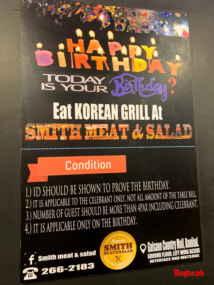 If you are celebrating your birthday at Smith Meat and Salad, you can dine for FREE. But you have to be with at least 3 paying companions. Still an amazing treat for you, think of ₱399 discount on your total bill. ;)