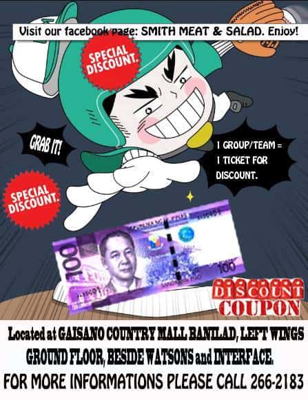 When you dine at Smith Meat and Salad, use the coupon below to get ₱100 OFF!
