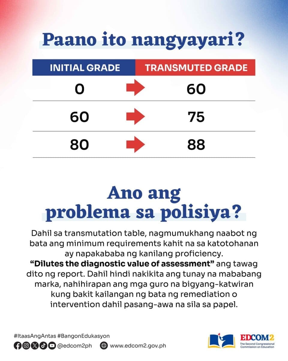 Closely linked to mass promotion is the commission’s call to roll back grade transmutation under DepEd Order No. 8, series of 2015. The policy uses a formula that can turn raw scores as low as 40% into passing grades. While meant to standardize grading, EDCOM II said it has instead masked poor performance and weakened the diagnostic value of assessments.