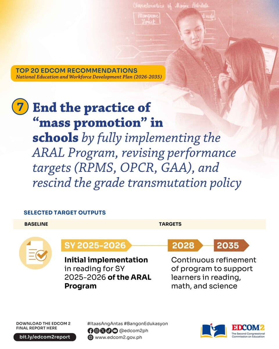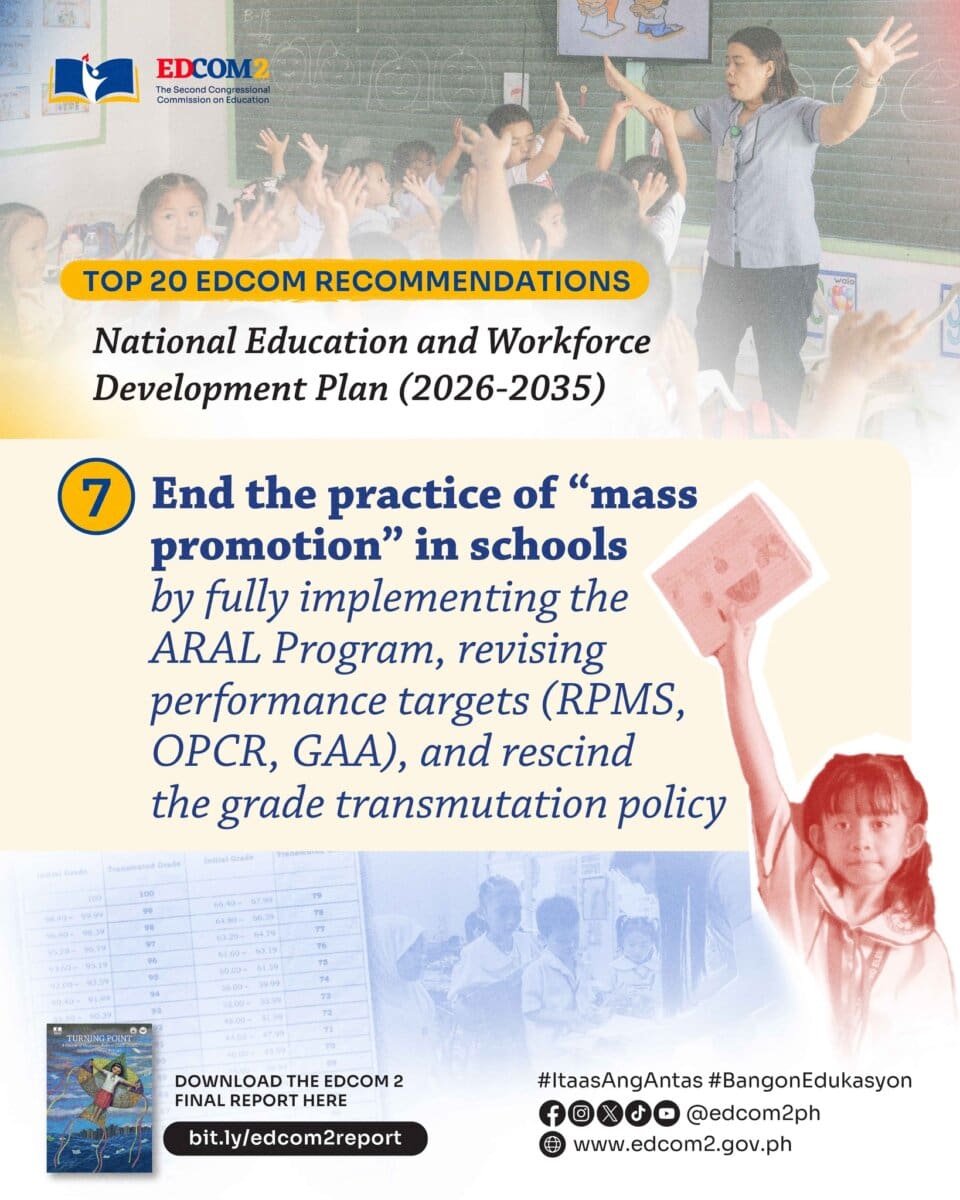 In its final report submitted to Congress on January 27, EDCOM II recommended holding back learners who fail to meet minimum literacy and numeracy standards, while also phasing out grade transmutation, a grading system that converts failing raw scores into passing marks. The commission said these practices have allowed students to move up without mastering essential skills, deepening the learning crisis in public schools.