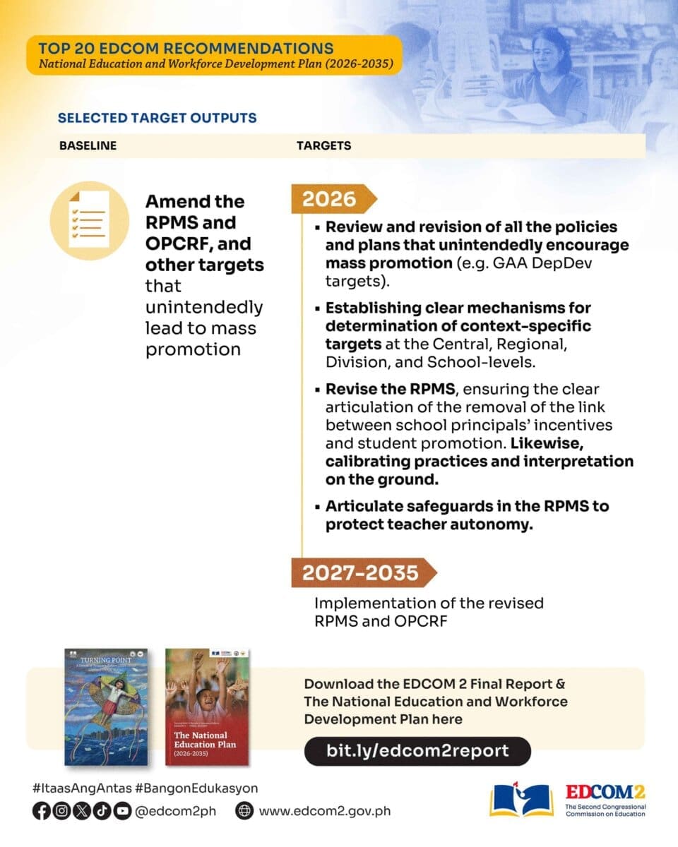 EDCOM II also called for changes to the Results-Based Performance Management System and school evaluation tools, saying current metrics indirectly encourage inflated grades. The report stressed that teachers’ professional judgment in promoting or retaining students must be protected from institutional pressure and used as a tool for learning recovery, not punishment.