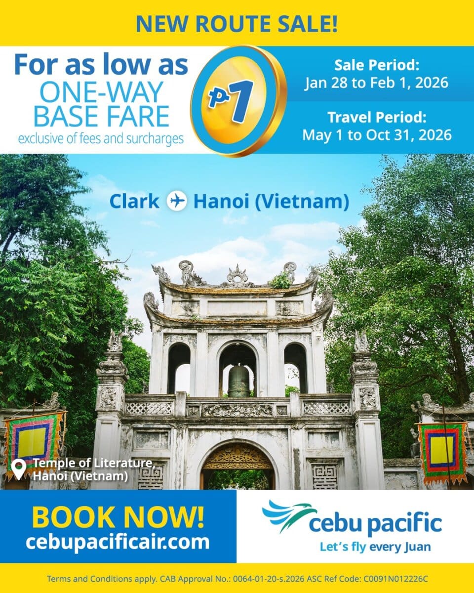 Filipinos planning a Southeast Asia trip now have a wallet-friendly option. Cebu Pacific is offering one-way base fares from Clark to Hanoi for as low as P1. The limited-time sale runs from January 28 to February 1 and covers travel from May to October 2026.