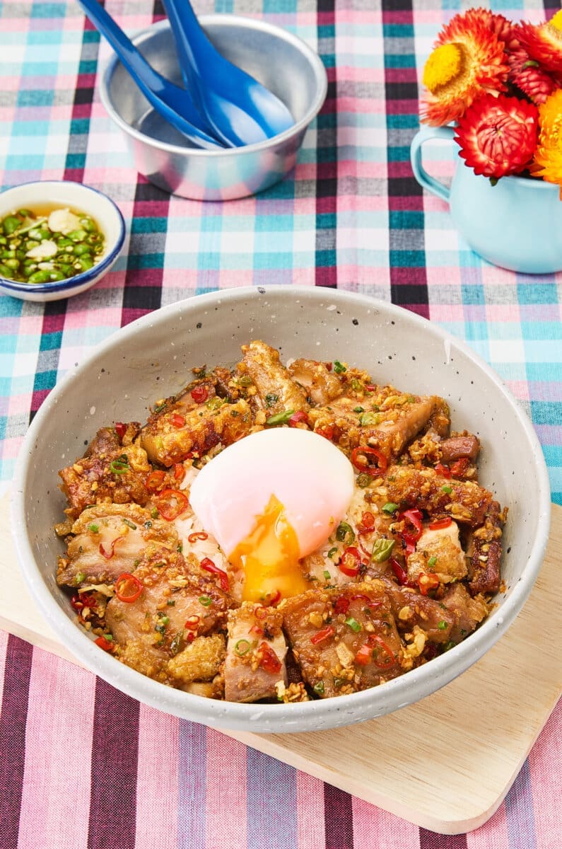 Chilli Salted Caramel Crispy Pork with Rice & Onsen Egg – Crispy pork stir-fried in chili and salted caramel, finished with golden garlic. Sweet, salty, and bold, balanced by warm rice and a silky onsen egg. Simple flavors, executed with serious technique.