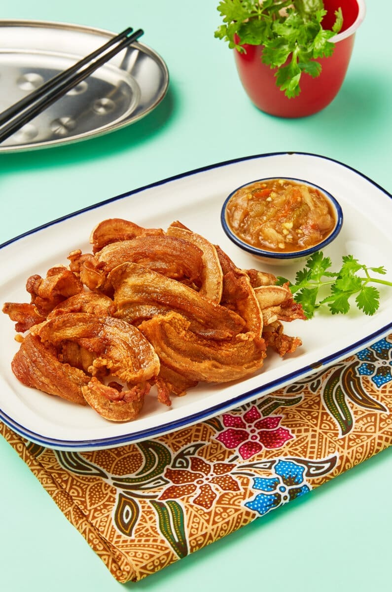 Crispy Pork Belly with Green Chili Dip – Crunchy, juicy pork belly paired with a refreshing green chili dip. Light acidity and gentle saltiness cut through the richness, making every bite dangerously addictive.