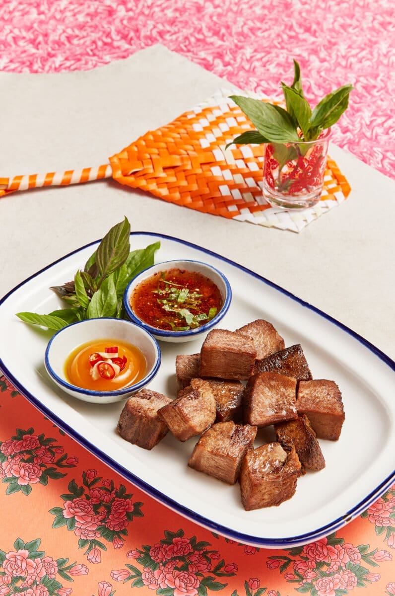 Grilled Ox Tongue with Pickled Egg Yolk & Jaew Sauce – Cooked low and slow overnight until melt-in-your-mouth tender. The cured egg yolk adds a deep, savory richness, while the Isan-style Jaew sauce delivers that unmistakable smoky, chili-forward kick.