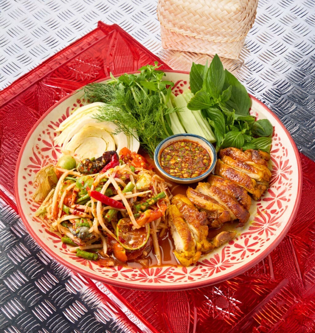 COLIMITED Som Tum Thai with Grilled Chicken – Juicy, marinated grilled chicken paired with classic green papaya salad. Refreshing, tangy, and perfectly balanced — served with fresh vegetables and authentic Thai sticky rice for a complete street-style meal.