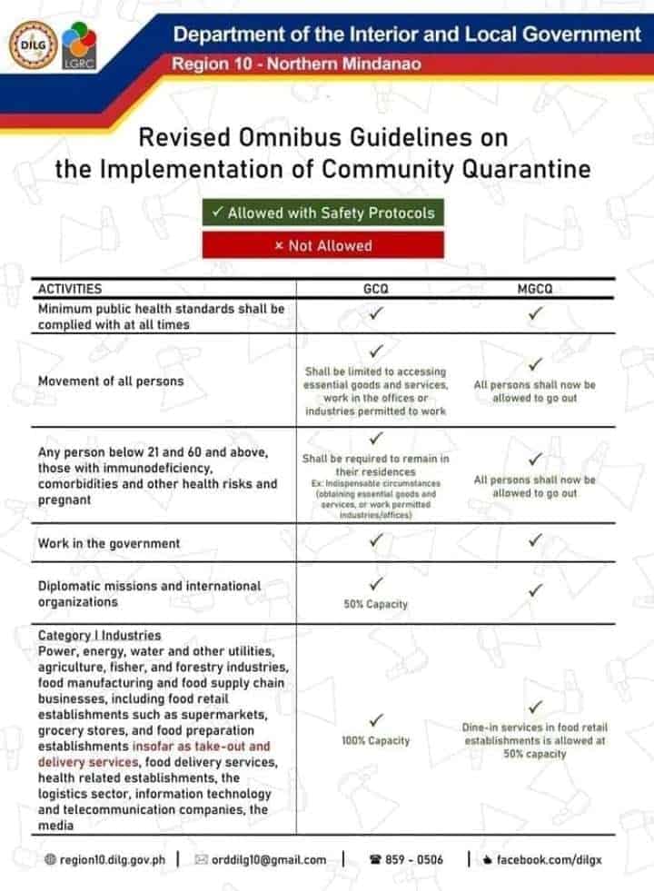 - Public transpo: Buses, jeepneys, v-hires, taxis, Grab at 50% capacity and strict physical distancing