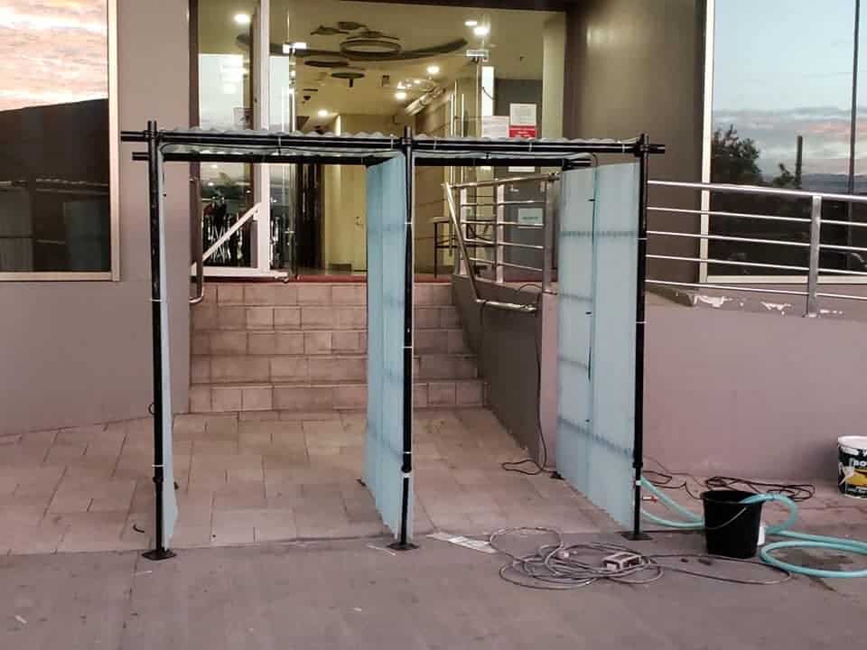 The SunnyTation Tent is a chamber installed with a sprinkler system that mists out a disinfectant solution for individuals prior to entering a public space.