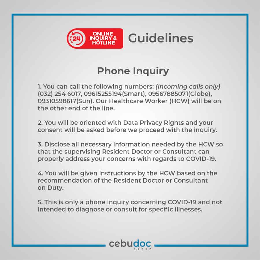 If you are sick and think you have symptoms of COVID-19, seek medical attention, call the local Coronavirus Health Information Line for advice: 0922-397-2334 / 0943-568-3298 / (032) 402-3091 / (032) 402-1269.