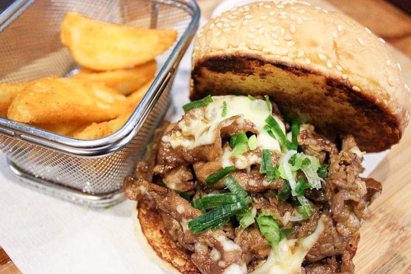 Marinated Sliced Pork with Grilled Mozzarella in Giant Bun with Potato Wedges – P260